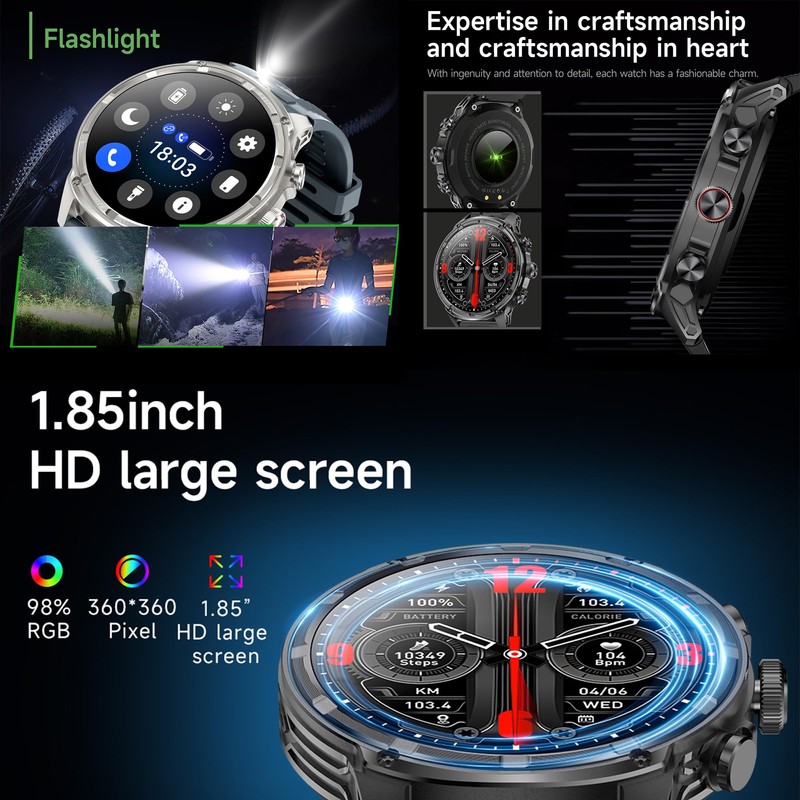 Men's Smartwatch with Phone Function, Torch, 1.85 Inch AMOLED 5ATM Smart Watch Activity Tracker with 123 Sports Modes Blood Pressure Sleep Monitor Pedometer Watch for iOS Android