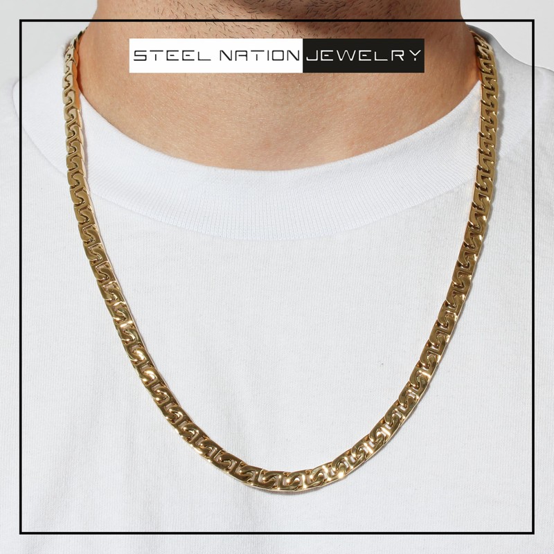 - METICULOUS ARTISTRY DISCOVER THE PINNACLE OF DURABILITY AND SHINE with Steel Nation Jewelry’s Mariner link chain. Crafted from stainless steel with a lustrous yellow gold tone finish, this chain resists tarnishing and offers enduring quality. Available from 20" to 24", it's expertly designed for ultimate versatility and elegance.
