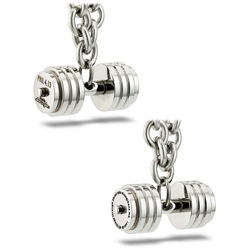 - DESIGN - Shields of Strength makes it easy to find jewelry for men who value the benefits of physical and spiritual strength. This stainless steel stacked plate dumbbell pendant on a linked chain necklace combines the design of traditional sports jewelry with the motivational words of the apostle Paul. The pendant carries the words of Philippians 4:13 reminding the wearer that Christ provides the necessary strength to accomplish anything in the gym and in life.