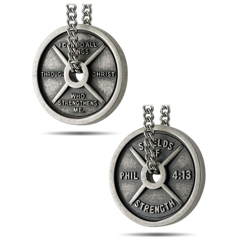 • DESIGN - When difficulties beset you, draw on the strength of the Lord to lift up your heart by wearing the Shields of Strength men's stainless steel with antique finish weight plate necklace. The front of the necklace has the Shields of Strength logo engraved at the top with “Phil 4:13” inscribed in the middle. The necklace makes a great gift for athletes or anyone who is encouraged by God’s timeless Word.Shields of Strength is a Texas based Company. We stand behind our designs.