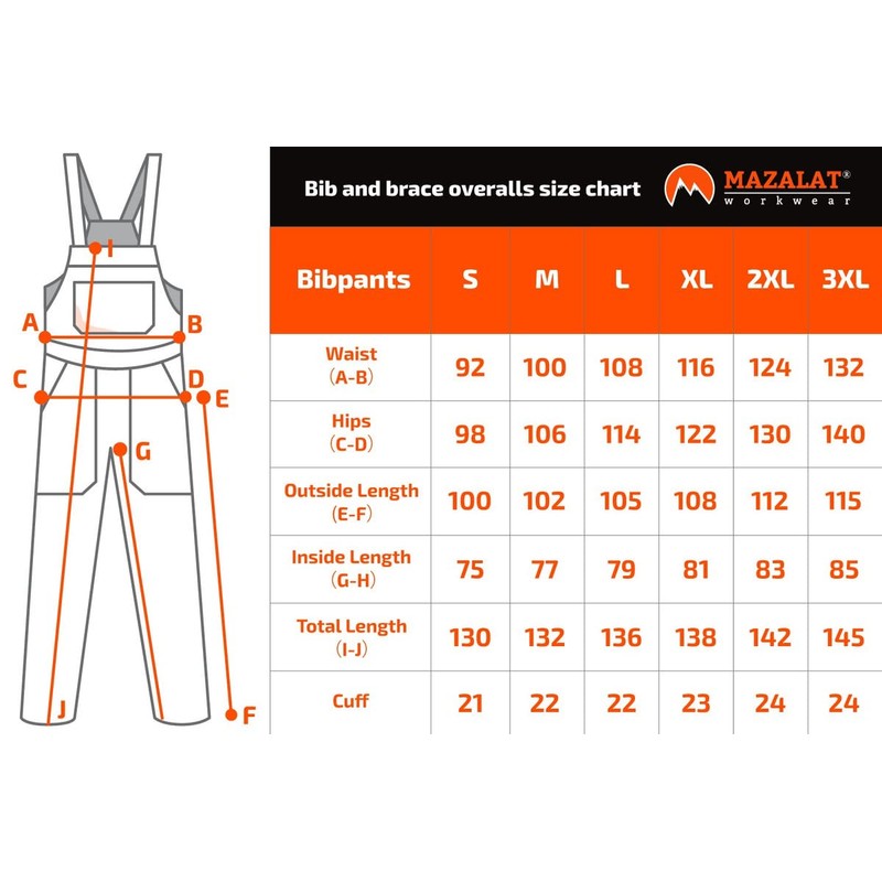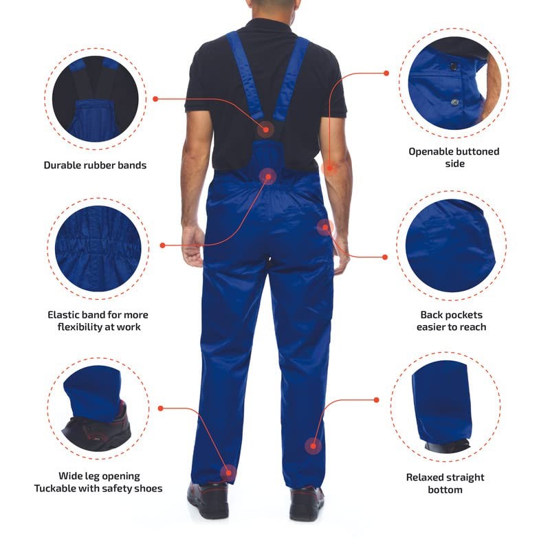- Work trousers sizes: S, M, L, XL, 2XL, 3XL, colours: black, white, red, blue, orange, yellow, grey, green, dark blue. Machine washable 40°C.