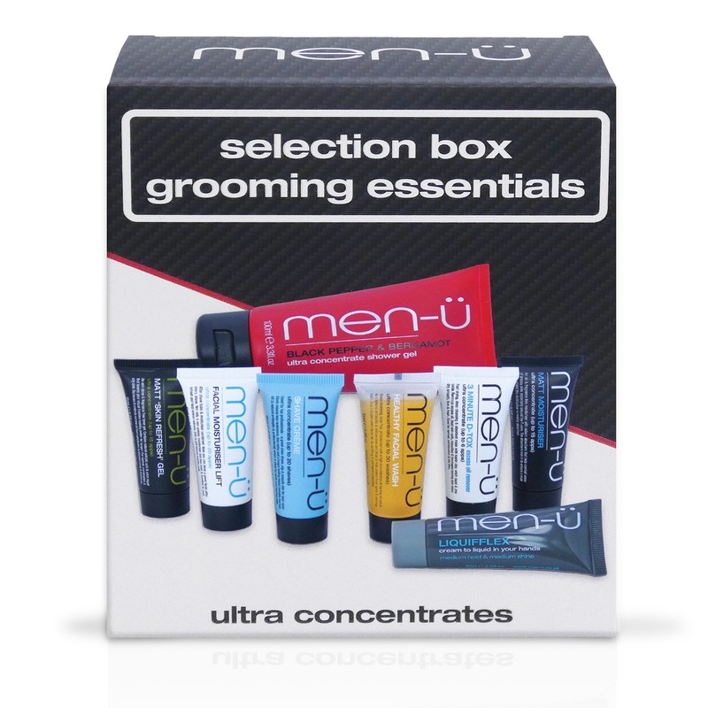 The men-ü Selection Box Grooming Essentials is a collection of grooming products that includes the full shave/facial range, Black Pepper & Bergamot Shower Gel, and the revolutionary styling product Liquifflex.