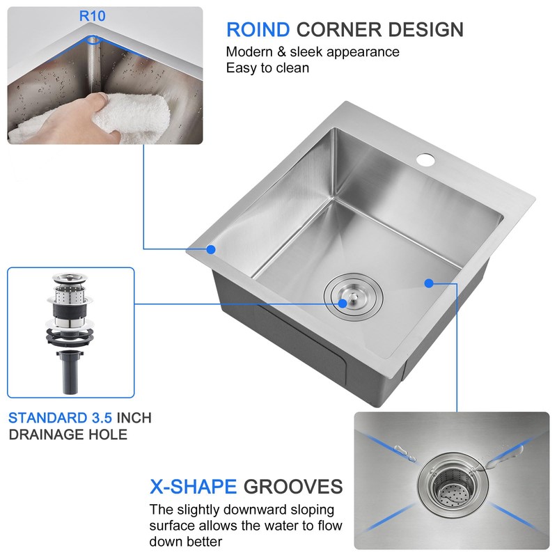 - 【Dimensions】The kitchen sink drop in 18" L x 18" W (front-to-back) x 9"H, Inner bowl dimension: 16*14*8", Minimum Cabinet Size: 20".This kitchen sink is designed for small kitchens or single hole kitchen sinks. It provides a compact and efficient solution for limited space.