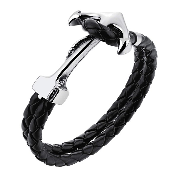 MENDOZZA Men's Anchor Bracelet Leather Stainless Steel Black Silver, Leather