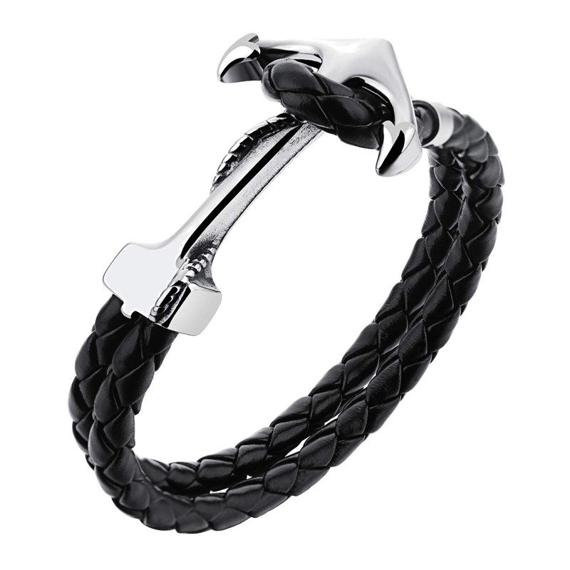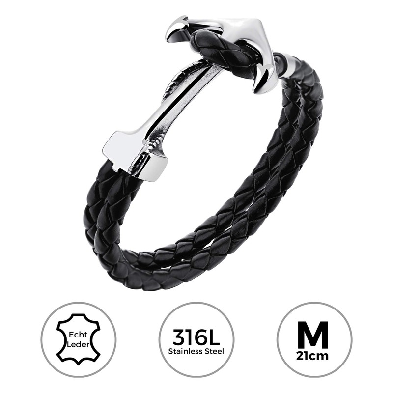 - This men's bracelet from Mendozza impresses with a modern masculine distinctive design. The bracelet is made of genuine leather and the anchor serves as a hook closure to open and close the bracelet. The braided leather fits perfectly with the solid stainless steel anchor.