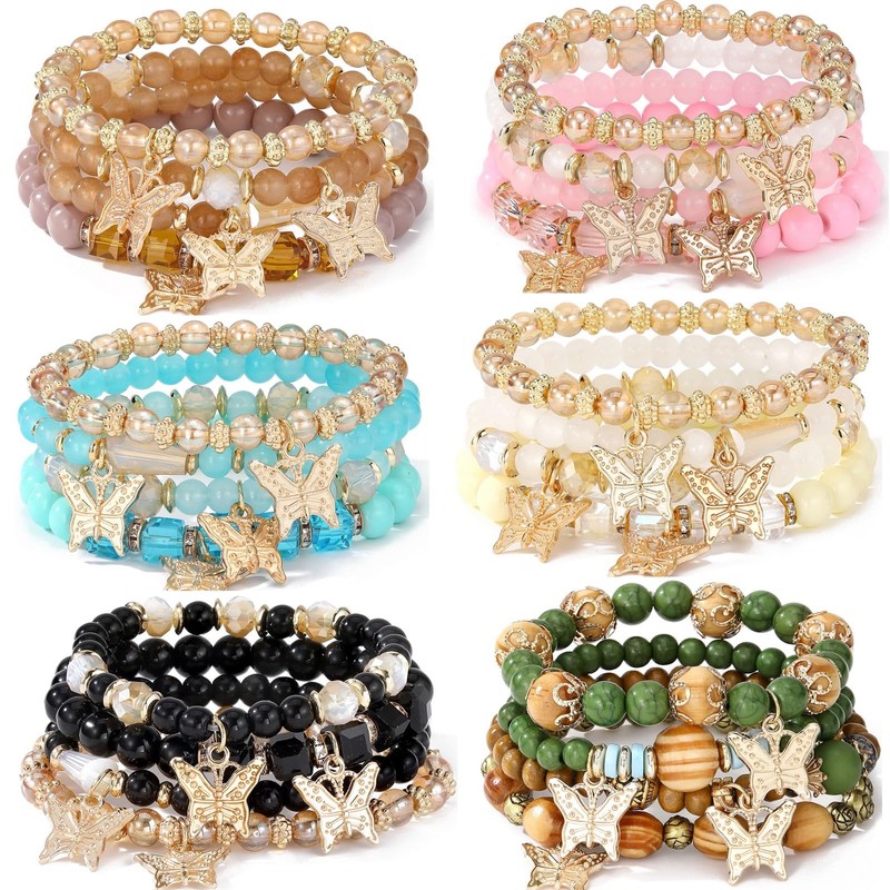 MengPa Butterfly Beaded Bracelets for Women Trendy Stacks Boho Bead Bracelet Pack Gold Friendship Jewelry(White Coffee Black Blue Pink Green) 6PCS