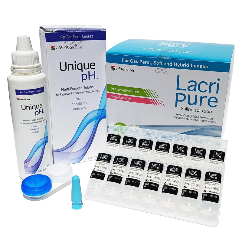 - This product is a bundle of 3 items: 1x 98 Vials Menicon LacriPure Saline, 1x 4 Oz Menicon Unique pH Multi-Purpose Solution and 1x DMV Scleral Cup Large Contact Lens Remover