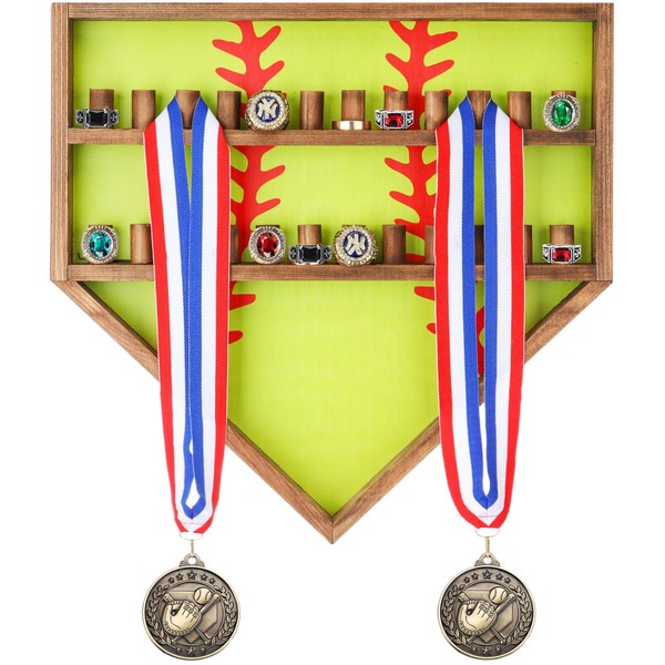 Menkxi Baseball Ring Display Case Wood Baseball Ring Holder Softball Championship Ring Holder Wall Mount Baseball Ring Stand Organizer for Medal Trophy Souvenir Collectables Gifts(Yellow)