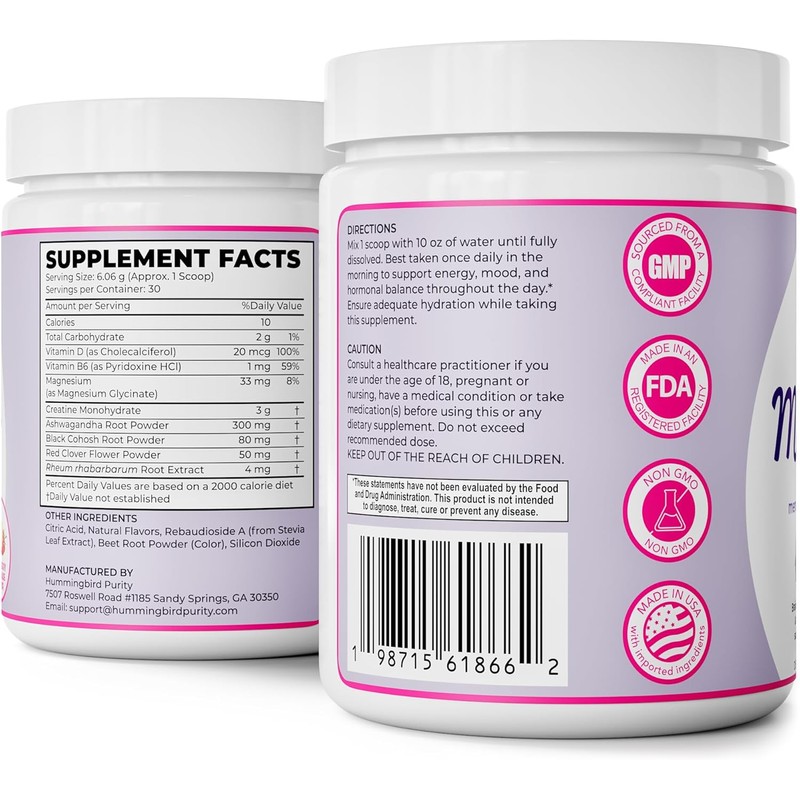- Specialized Menopause Supplement – A balanced blend of creatine monohydrate, black cohosh root, red clover, rhapontic rhubarb root, ashwagandha, vitamin D3, vitamin B6, and magnesium glycinate. Formulated to help support bone and muscle health, hormonal balance, mood, cognitive function, energy, and sleep quality.