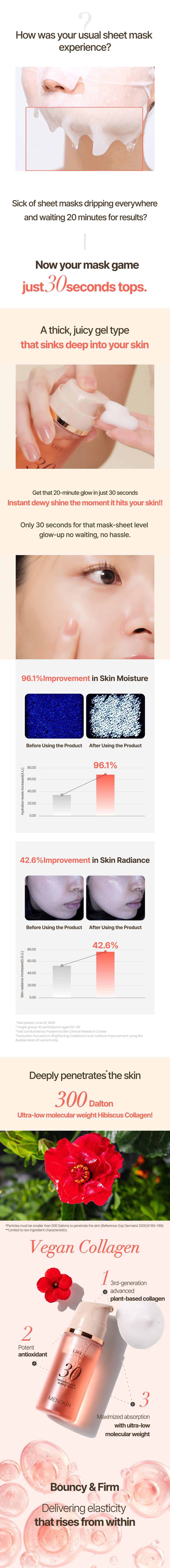 The bouncy foam formula absorbs deep into skin, showing immediate water glow within 30 seconds of application and providing hydration and radiance improvement. Offers firm, bouncy skin with a non-sticky collagen mask pack. Outperforms sheets in improving skin moisture, glow, and radiance, using MICRO BUBBLE CAPSULE™ technology that leaves foam gently on skin to aid absorption instead of a sheet.