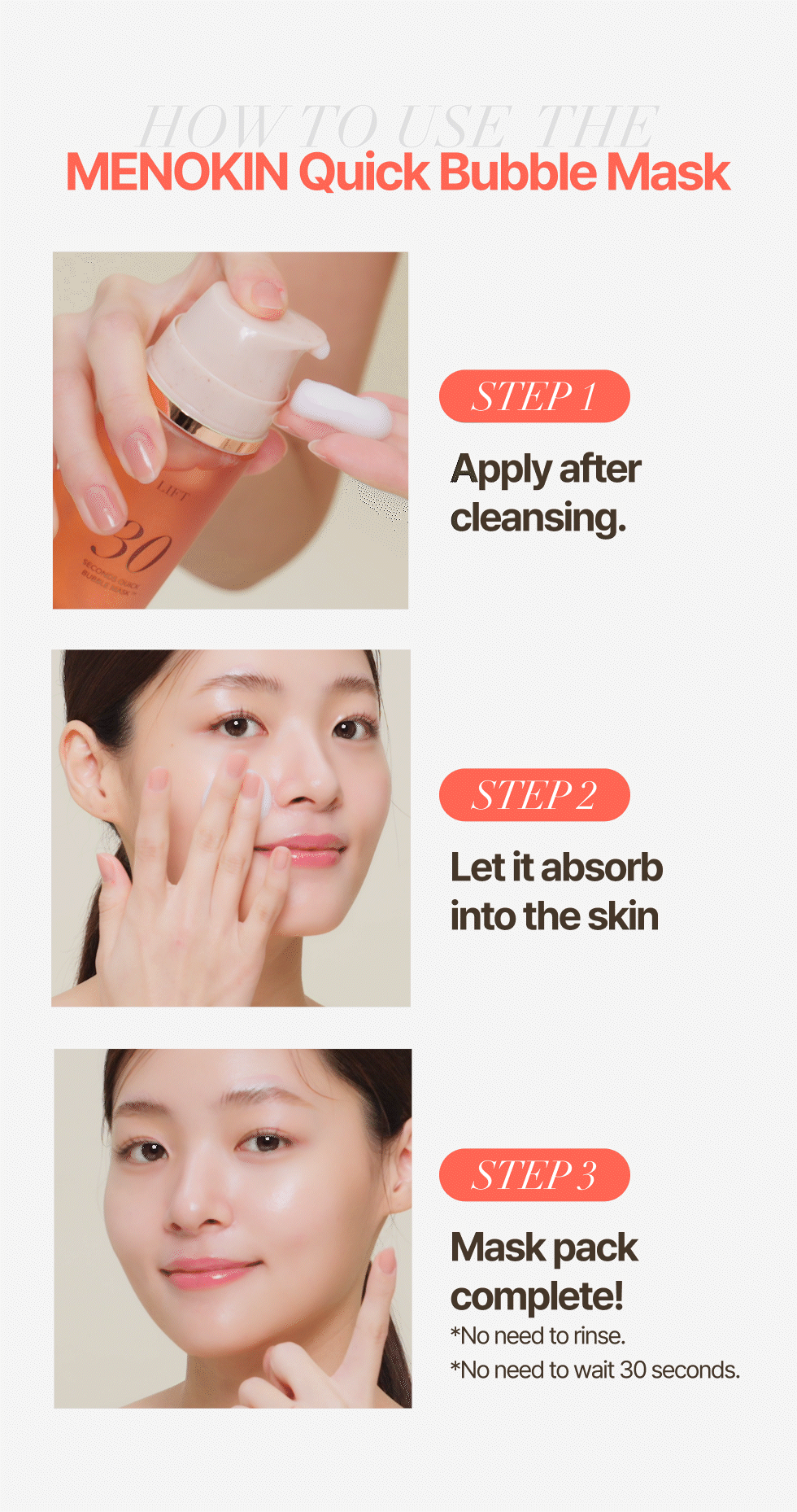 1. Apply after cleansing 2. Let absorb 3. Mask pack complete! No rinsing required.