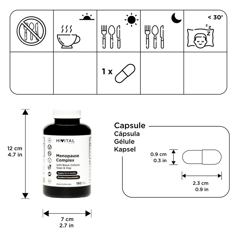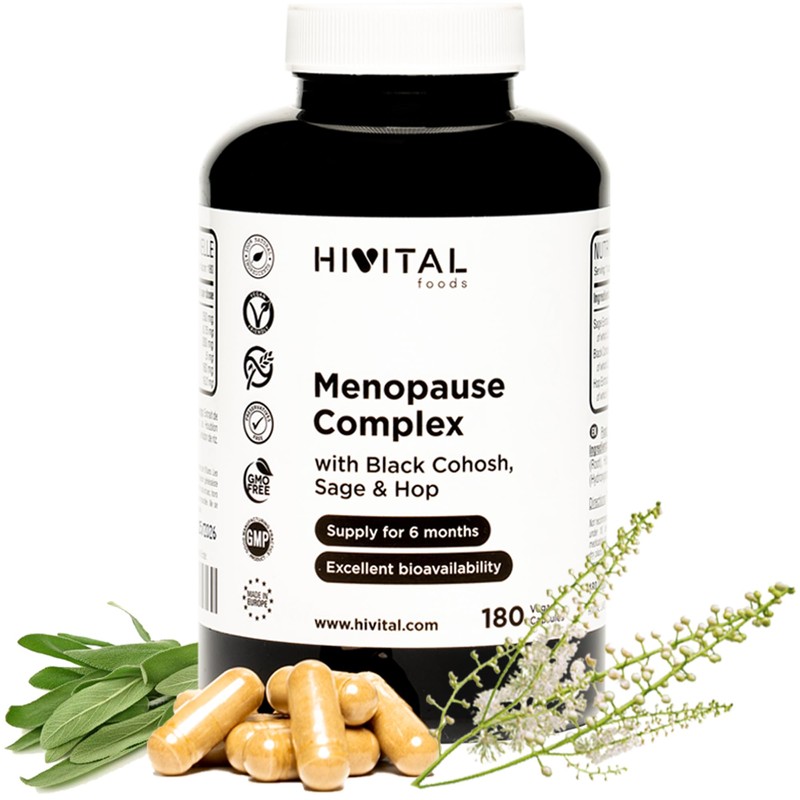 Menopause Complex. 180 Vegan Capsules for 6 Months. With Sage, Black Cohosh and Hops. Combats the symptoms of menopause and premenopause such as hot flashes, insomnia and flatulence.