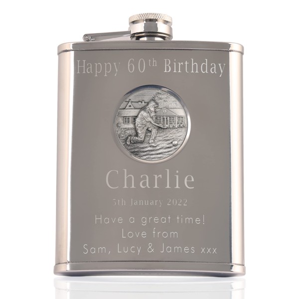 - Personalised Engraved 60th Birthday 6oz Stainless Steel Hip Flask with Solid Pewter Lawn Bowls Feature