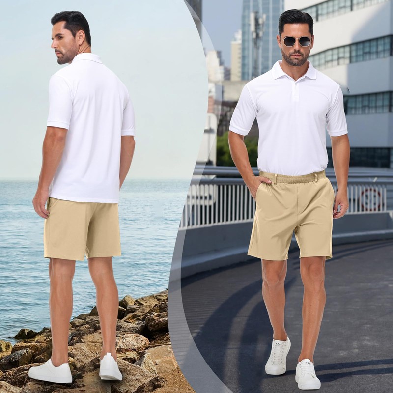 Mens Casual Khaki Golf Shorts 7 Inch Inseam Regular Fit Built-in Liner Stretch Elastic Waistband Zipper Pockets No Pill
