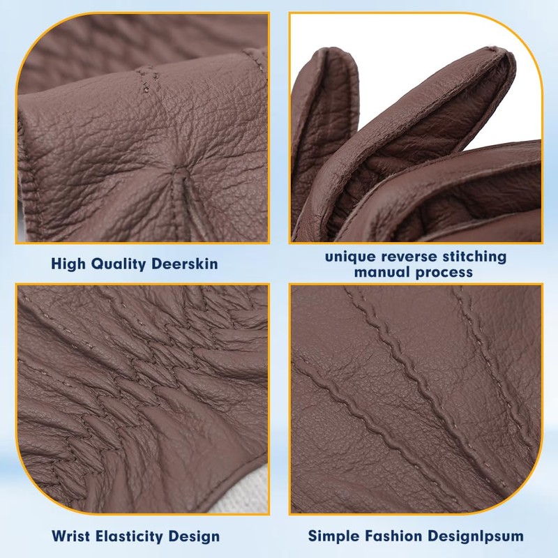 - The mens leather gloves outer layer is made of genuine deerskin. The lining is made of high quality soft and warm cashmere,so it can withstand the winter cold.Breathable, water-repellent and wind-repellent, the glove wears like a second skin,These gloves are soft, comfortable, and have particularly high durability, even after a few years, they will look like new,