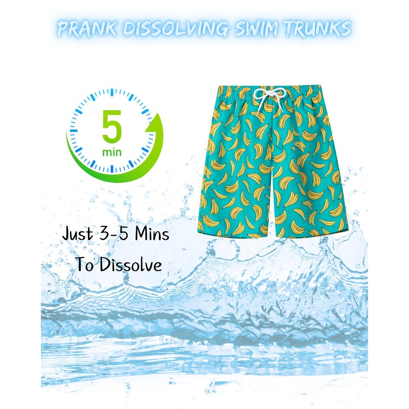 - **Rapidly Dissolving Design** - Engineered with special dissolvable sewing thread, these swim trunks are primed to disintegrate about four minutes after hitting the water. Perfect for a shocking yet harmless prank.