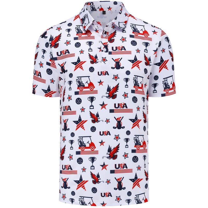 Mens Golf Polo Shirts Short Sleeve Performance Moisture Wicking Dry Fit Casual Print Funny Golf Polo Shirts for Men Patriotic USA American Flag Shirts for Men