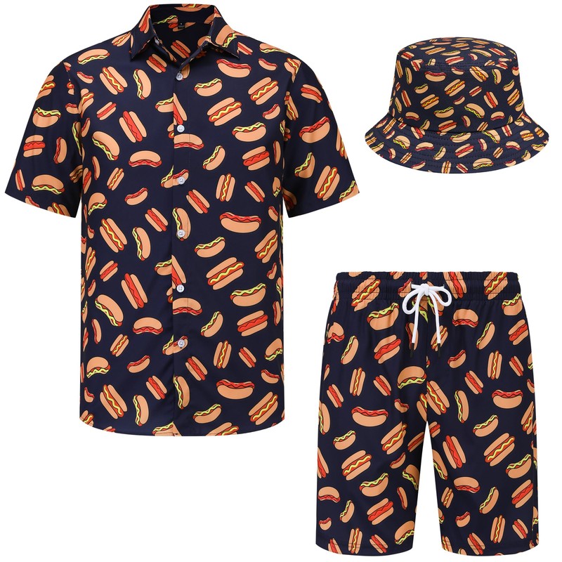 Mens Hawaiian Shirts and Shorts Set 2 Pieces Tracksuit Beach Outfits Summer Vacation Tropical Suit Hot Dogs Hawaiian Shirts With Bucket Hats