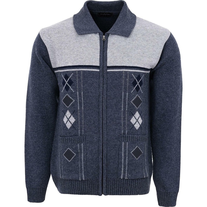 Mens Knitted Cardigan Chunky Knit with Full Zip Front Closure Collared Neck Front Pockets, X-Large, Denim