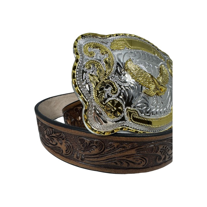 Mens Leather Western Oak Design Belt Handmade in USA with Large Eagle Buckle Size 30-52 (44)