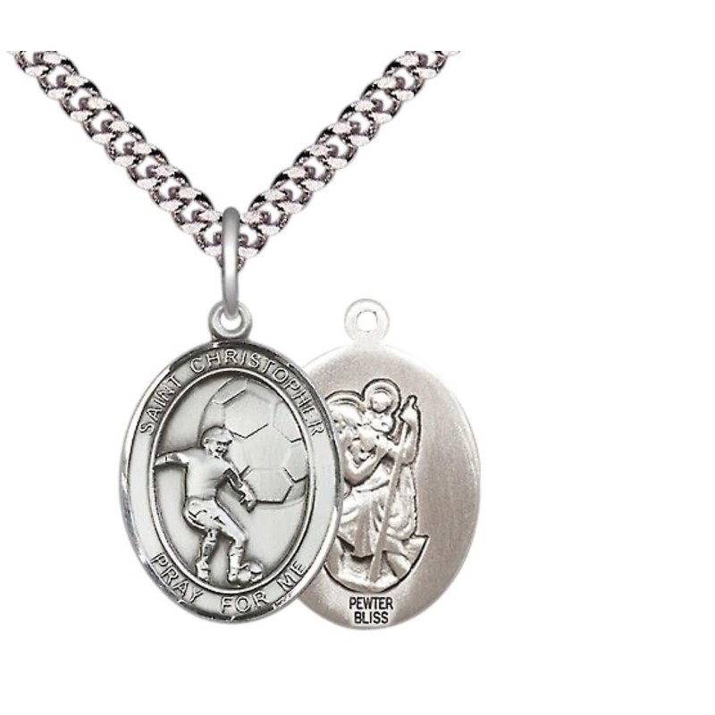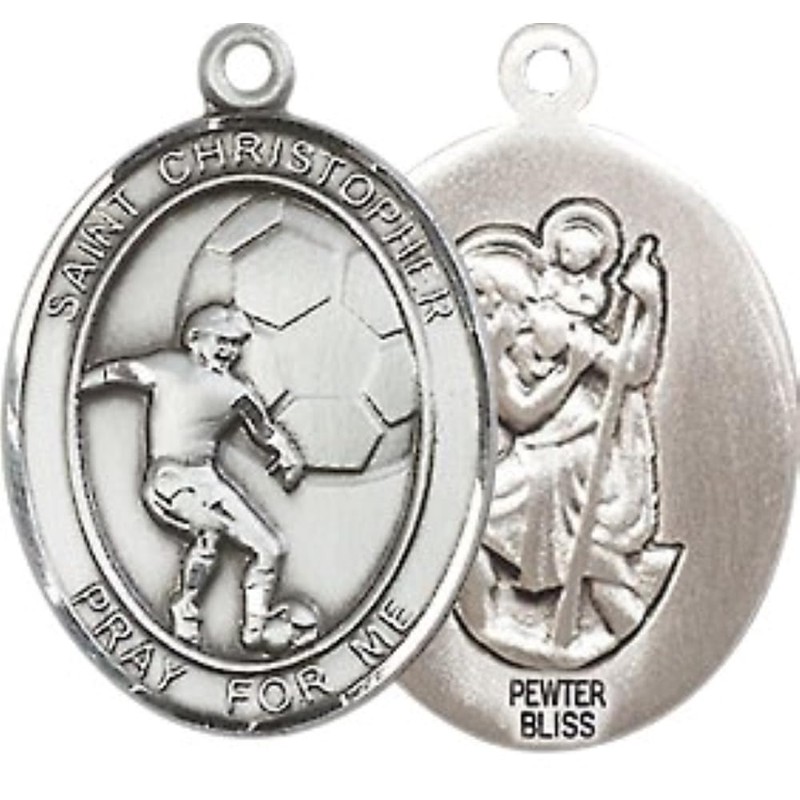 - ✅ SAINT CHRISTOPHER SOCCER MEDAL PENDANT Hand-engraved pewter pendant measuring 3/4" x 1/2", honoring the Patron Saint of Travelers and Motorists with a distinctive soccer design.