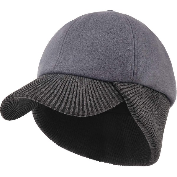 Mens Wool Winter Baseball Cap with Warmer Earflap Outdoor Beanie Ski Visor Hat (Grey)