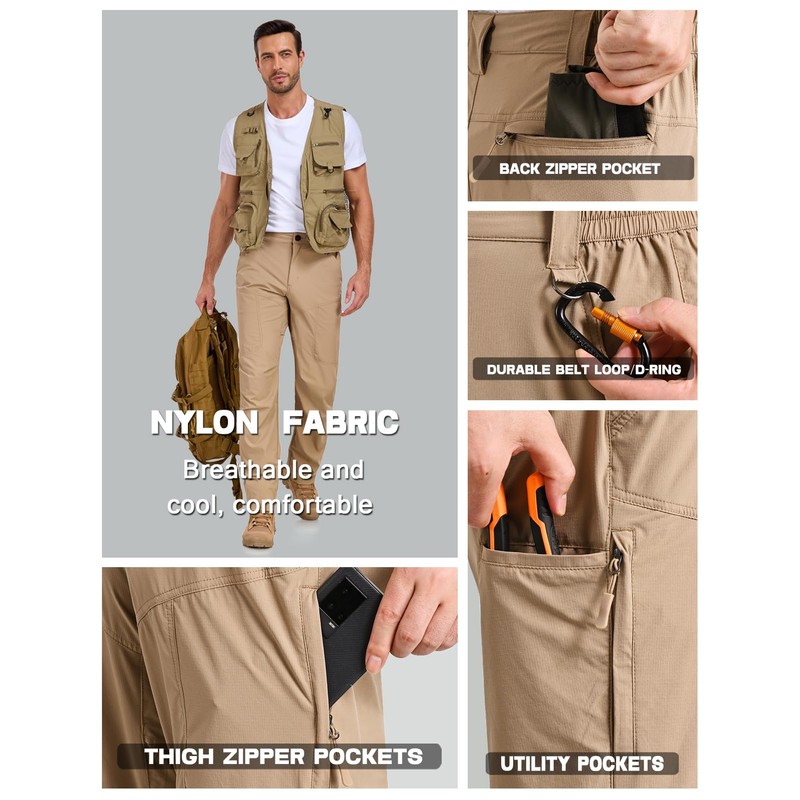 Mens Work Pants Lightweight Breathable Cargo Hiking Pants Outdoor Waterproof Quick Dry Stretch Tactical Travel Trekking Pants with Zipper Pockets Khaki 42Wx30L