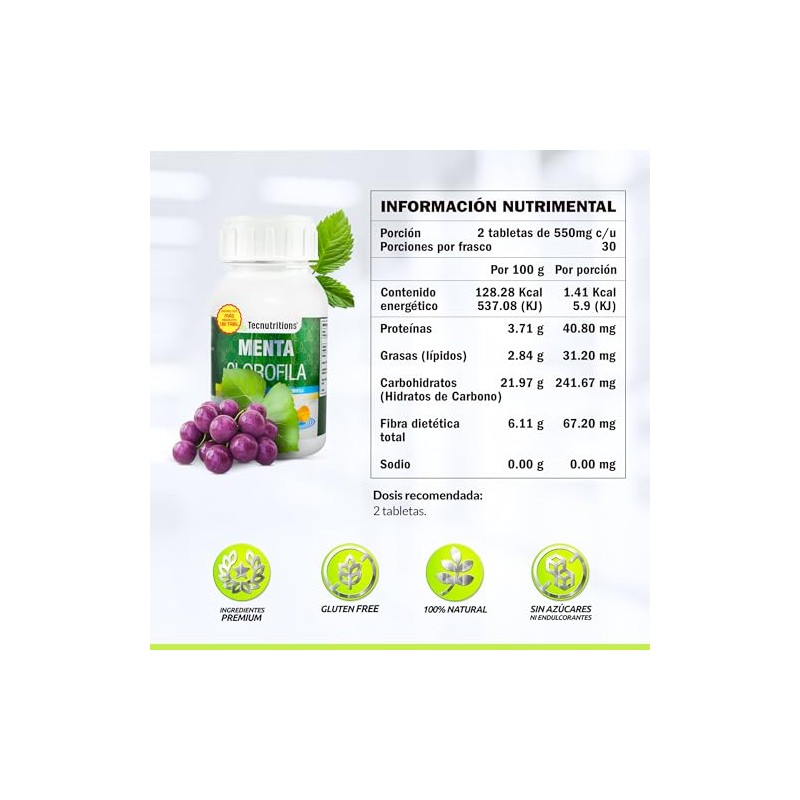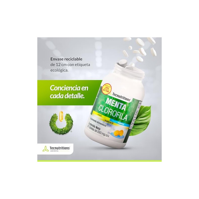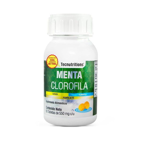 Menta Clorofila | Suplemento Natural con Menta, Clorofila, Cúrcuma, Alfalfa y Té Verde | Apoyo Digestivo y Bienestar General con 180 tabletas de 550 mg c/u. TECNUTRITIONS