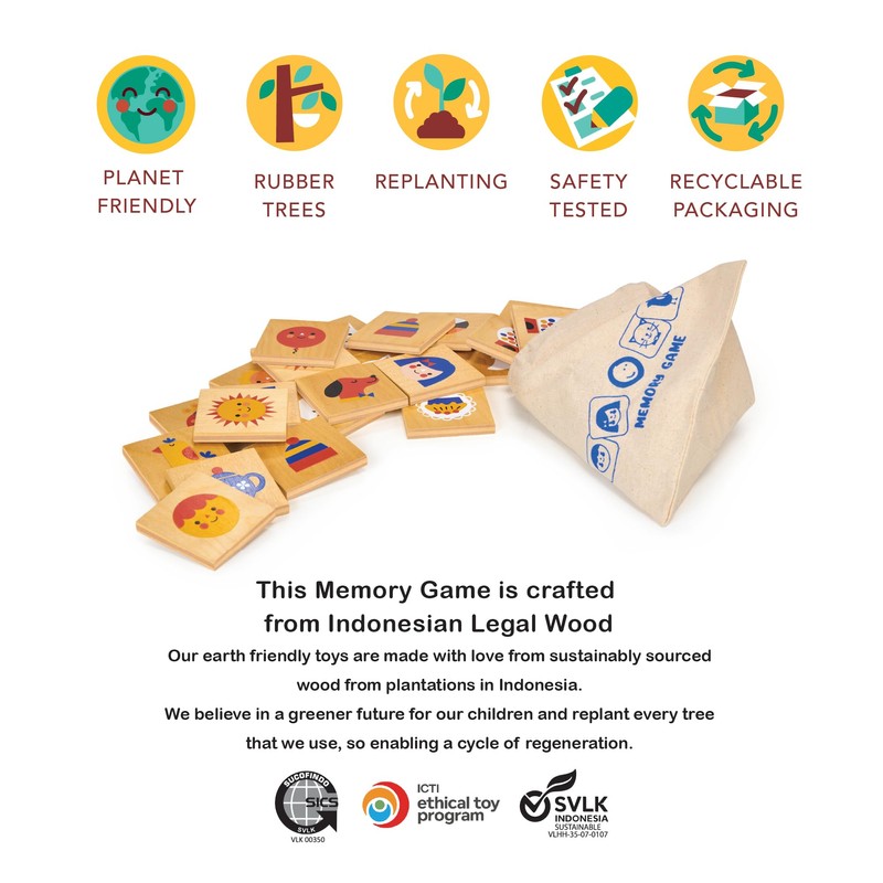 Mentari Toys - Memory Game - 32pc Wooden Matching Memory Game for Toddlers and Kids - Fun Learning Toy with Illustrated Tiles and Fabric Bag - Improve Concentration and Recognition - Age 3+
