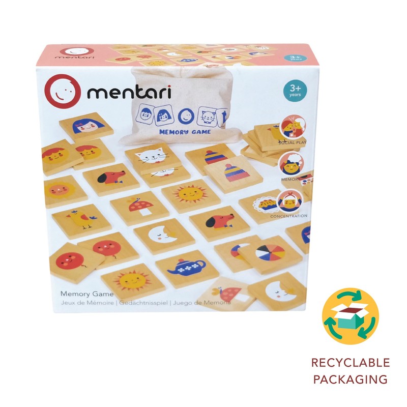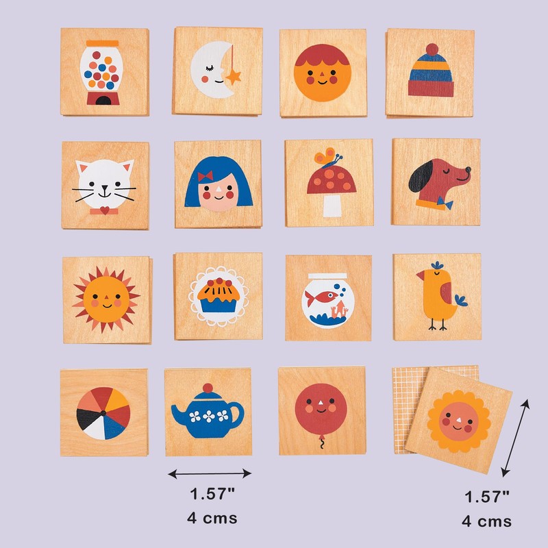 - TEST YOUR MEMORY - Memory Game is an awesome wooden matching game featuring 16 pairs (32 pieces) of charming illustrations, including a gumball machine, balloon, kitten, moon, sun, and little faces. Lay the pieces face down and take turns flipping over two at a time to find matching pairs. Keep the pairs you find and try to remember the positions of the others. The game ends when all pairs are found, and the player with the most pairs wins!