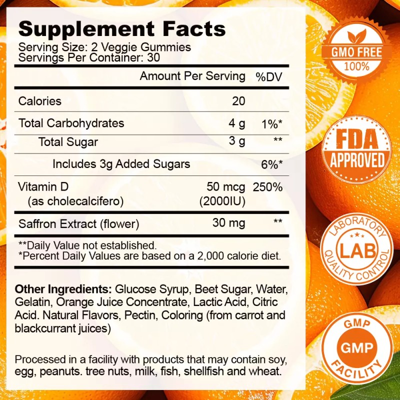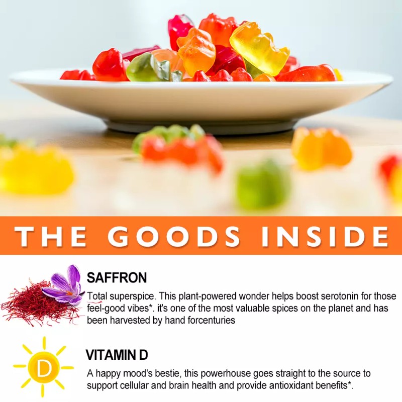 Nutritional supplement: The main ingredients of our gummies contain saffron and vitamin D. Saffron has powerful mood-balancing properties that can keep you emotionally stable and optimistic.
