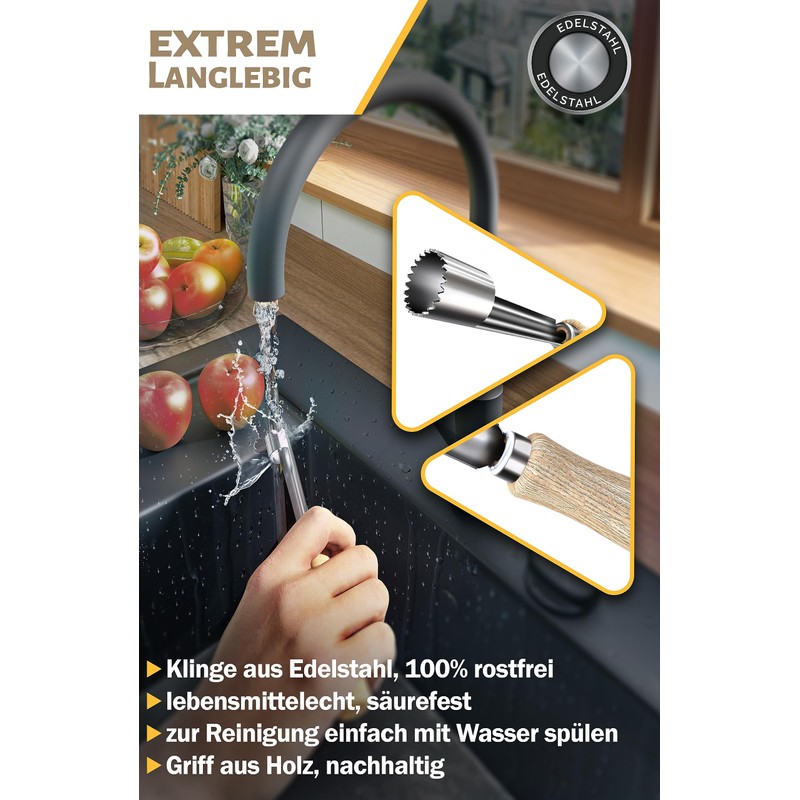 - Also suitable for large fruits: The stainless steel blade of the corer is long enough (7.5 cm) for larger apples or pears. The serrated edge penetrates the pulp effortlessly, the blade is particularly sharp.
