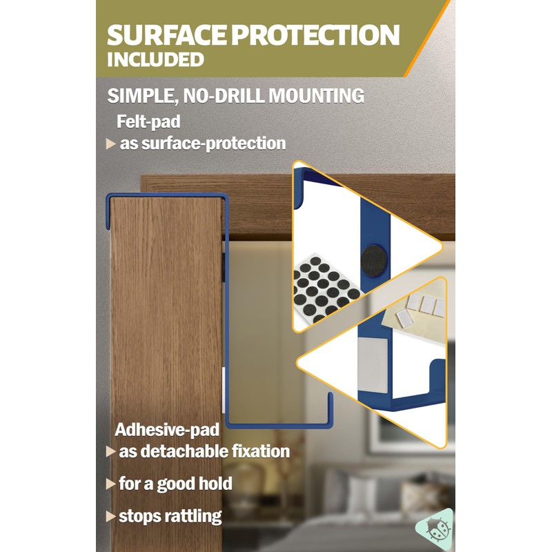 - SURFACE PROTECTION INCLUDED - Each over the door hook is equipped with an adhesive pad for a non-slip, rattle-free hold, as well as a felt pad to protect the door surface from scratches. Easy installation of the door hooks without drilling.