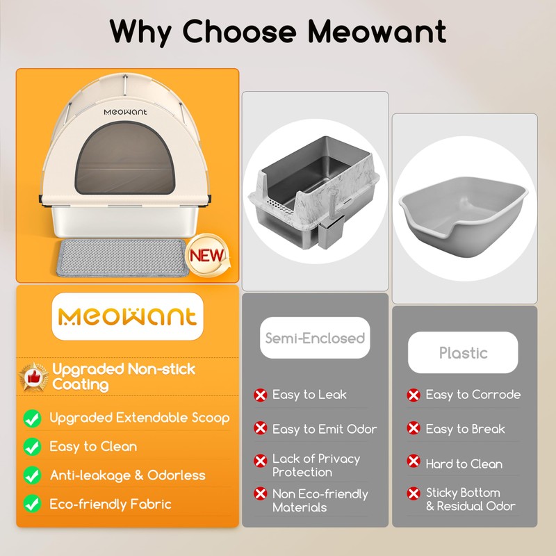 - 2025 Newly Upgraded Litter Box: Meowant cat litter box innovatively uses a stainless steel liner + spray paint coating, which is more scratch-resistant, rust-resistant, and anti-stick than ordinary stainless steel cat litter boxes, and the cleaning difficulty is reduced by 50%! There is also an Eco-friendly oxford fabric tent cover to satisfy your cat's curiosity!