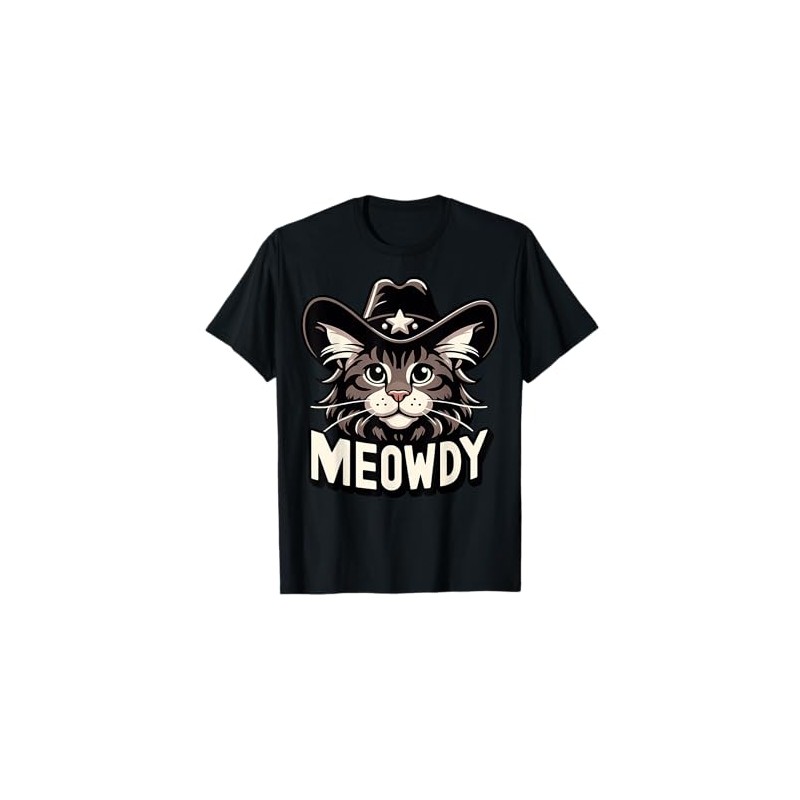 - A funny Maine Coon cat wearing a cowboy hat and offering a friendly "Meowdy" greeting. A unique humorous design for cat lovers with a country western aesthetic.