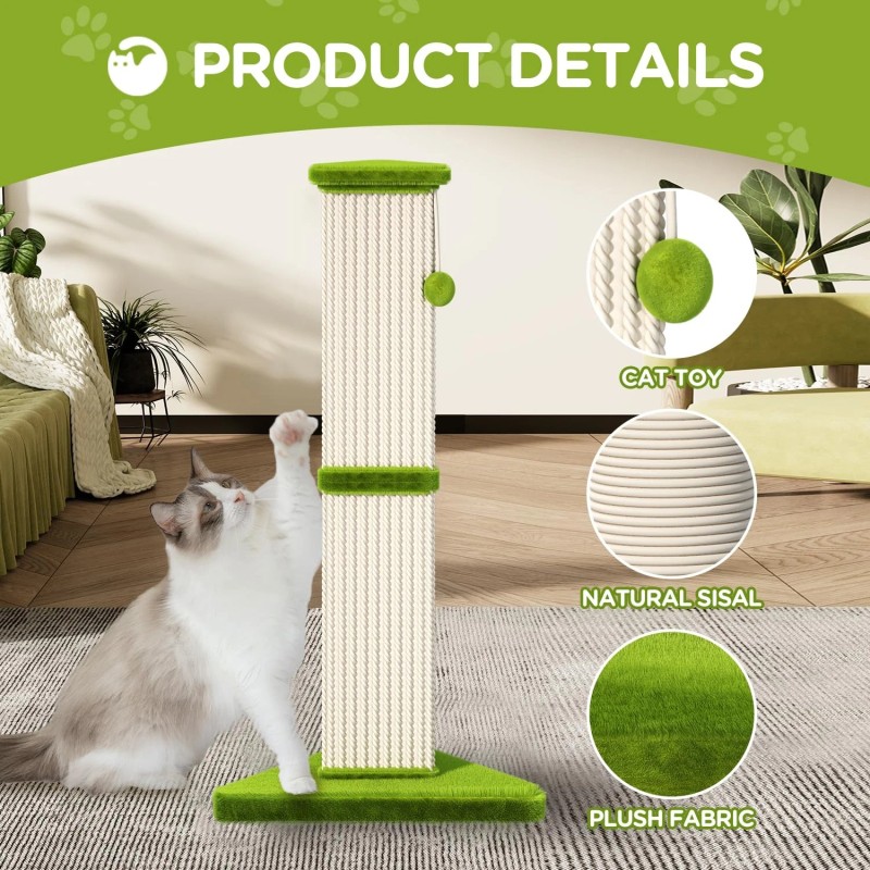High-quality material: The natural sisal rope is absolutely appealing to cats, satisfying their natural instinct to scratch while protecting expensive furniture. The base tower is heavy-duty particleboard, covered with soft plush, and handcrafted