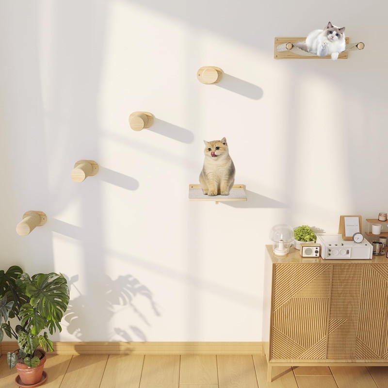 MeowHomm Cat Wall Shelves, Wooden Cat Wall Furniture Includes 4 Scratching Post Steps, Jumping Platform, Hammock for Kittens
