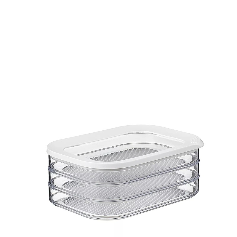 The Mepal cold meat storage container Modula 550/3 is suitable for storing different meat products in one box. The kitchen storage container consists of 3 different compartments that are stackable. So, you can store meat slices of sausage, chicken, bacon and salami separately in the fridge organiser. The container for food features a sealing ring which ensures perfect seal, making this kitchen organizer suitable for storing various meat products. The rectangular Modula meat boxes with rounded corners have a capacity of 1650 ml. In addition, the ham holders & bacon containers from Mepal are transparent and have a clear lid. This gives instant visibility of contents, even in the fridge. It is good to know that the Modula containers of Mepal are available in different sizes and colors. Also, like all Mepal storage boxes, the Modula meat cuts container is food-safe, 100% BPA-free, stackable and dishwasher-safe. No matter how demanding you are: Modula storage boxes are up to it!