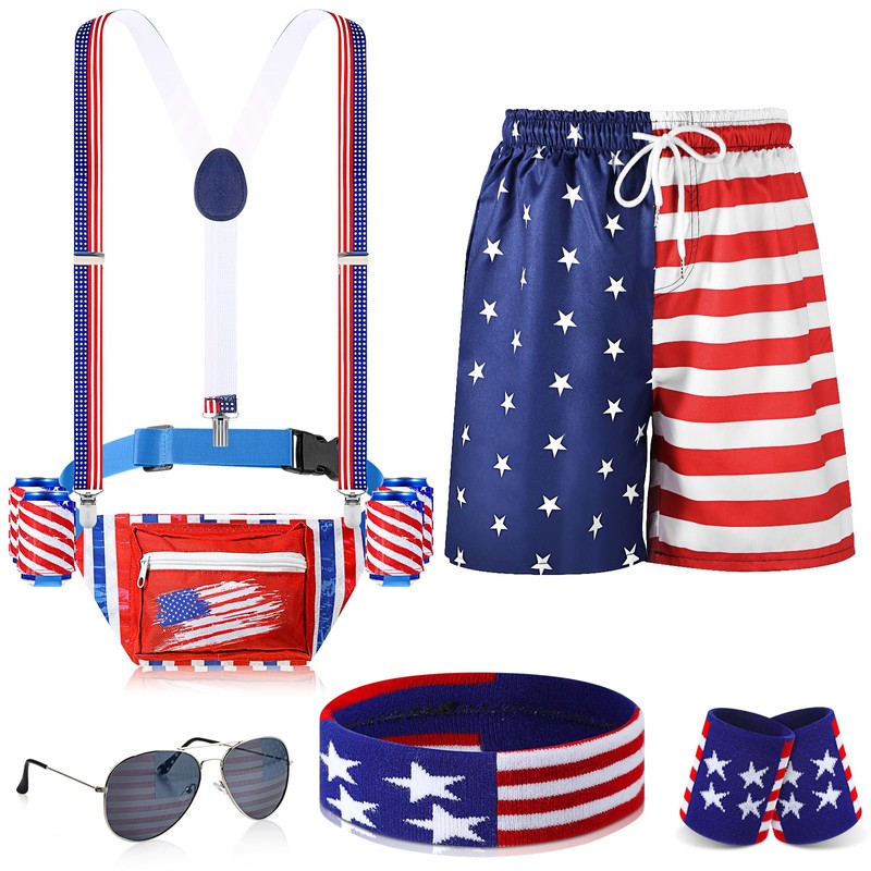 - Package Content: you will receive 1 American flag fanny pack with beer holder, 1 American flag short pant, 1 USA headbands, 1 pair of USA sweatbands for wrists, 1 silver rimmed glasses and 1 adjustable suspenders, available in a wide range of accessories to suit your matching or wearing needs