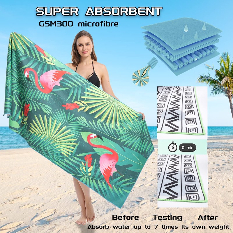 - ABSORBENT & FAST-DRYING : Our quick dry beach towel is made of quality GSM300 microfiber, super soft, absorbent, quick dry and wonderful to the touch, wandering on a beach or just cozily lying on the beach, have a nice sunbath. After you cool off in the ocean, you’ll be amazed by how quickly they soak up the water. And it dries 3 times faster than a regular cotton towel.