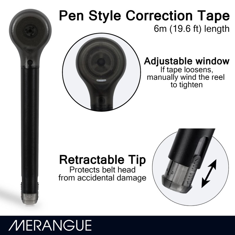 - Correction tape with a unique pen style design, providing a comfortable grip and a convenient to use way to correct handwriting