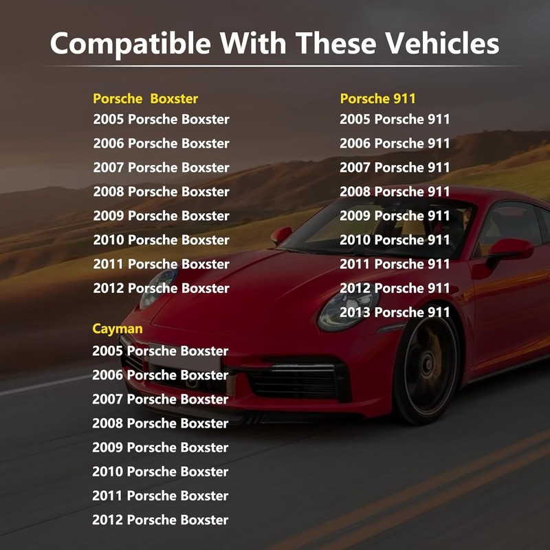 - Compatible with: 911 Coupe (997) (07.2004 - 12.2012), Boxster (987) (11.2004 - 12.2011), 911 Convertible (997) (04.2005 - 12.2012), Cayman ((11.2005 - 12.2013), Boxter Spyder (987) (09.2007 - 12.2011), 911 Speedster (997) (08.2010 - 05.2011).