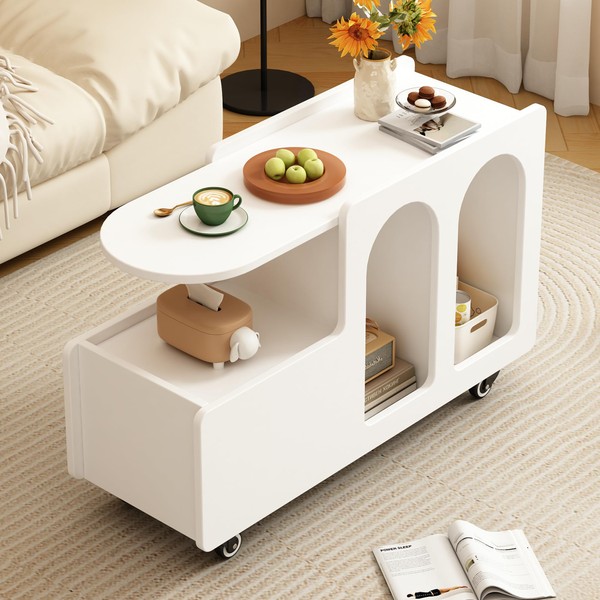 Merax Mobile 21.2" H End Table on Lockable Wheels,Cream Style Nightstand Narrow Coffeetable with Multi-Layer Storage for Living Room