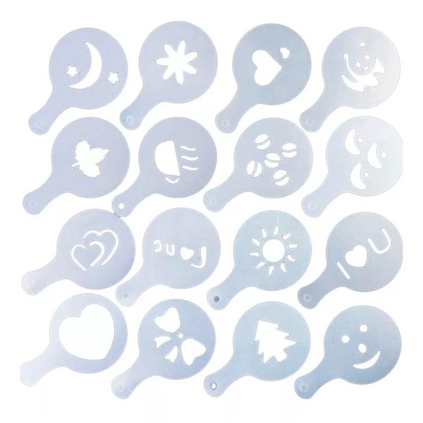 El set cuenta con 16 plantillas decorativas de plástico que permitirán moldear el diseño seleccionado sobre la espuma del café o capuchino, es ideal para agilizar el trabajo dando como resultado un hermoso diseño sobre la espuma.