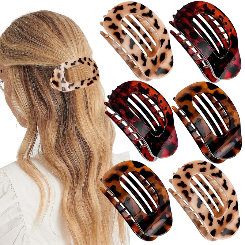 mercham 6 PCS Flat Hair Clips for Women, Curved Claw Clip with Strong Hold, Perfect for Lying Down or Driving, Flat Claw Clips for Thin, Thick & Curly Hair, Simple & Elegant Hair Accessories (Leopard)