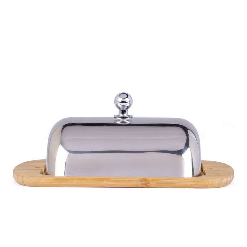 • STAINLESS STEEL LID & REMOVEABLE BASE COVER. The lid is designed to keep the butter fresh and reduce the absorption of refrigerator odors. It is made out of high quality stainless steel. The lid is rust and impact resistant while the stainless steel knob on top makes handling and lifting of the lid very easy and convenient. The base also includes a stainless steel cover to prevent stains on the bamboo base
