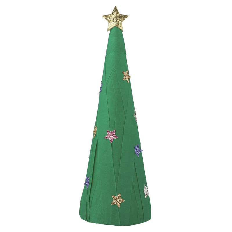 - GREEN CREPE PAPER. It is crafted with green crepe paper covered with ECO glitter stars, and a star on top.