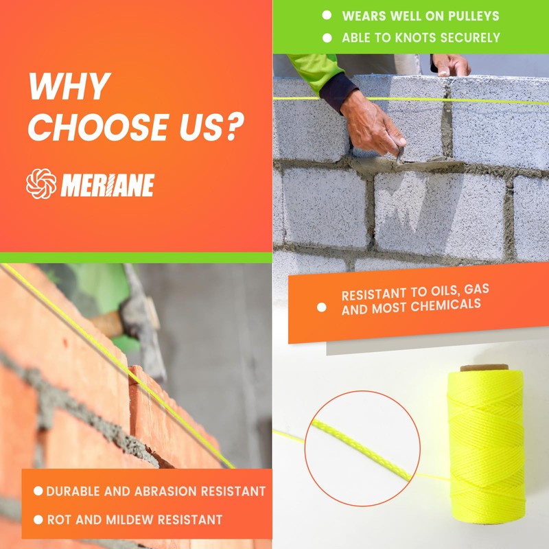 - Superior material: Made by high strength virgin nylon yarn. Stronger than polypropylene thread, reliable and flexible, resistant to moisture, oil, corrosion, and weather conditions, providing you with long-lasting service time. Excellent durability makes it withstand the hit of a trowel, will not tangle and kink stretch, which is preferred by masons and contractor