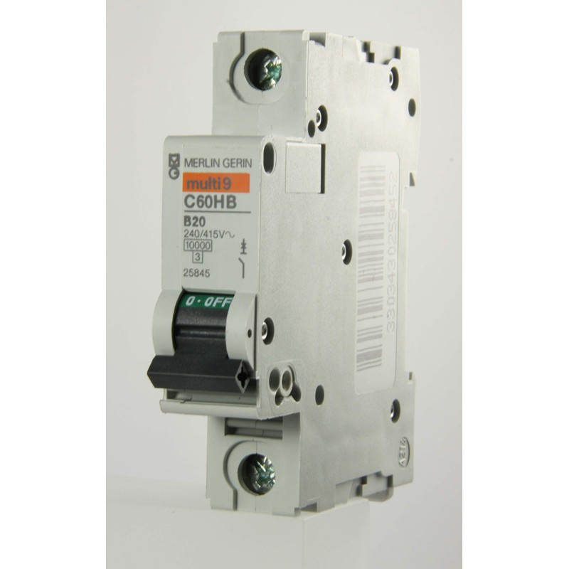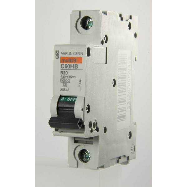 Merlin Gerin Multi 9 C60HB120 Type B single pole MCB - The C60 Multi 9 - Isobar 4 circuit-breaker is a miniature circuit-breaker used for the protection of circuits in industry and the tertiary sector. It ensures the following functions: protection against short-circuit and overload currents, isolation, protection of persons against indirect contact. - Compliance with standards: IEC EN 60898 or IEC 60947-2 depending on the version, certified by national official authorities. - Suitable for isolation in accordance with industrial standards: IEC 60947 Operating voltage: up to 440 Vac, insulation voltage: 500V Optional add-on earth leakage modules: C60 Vigi Optional auxiliaries: indication of state and tripping, shunt trip, undervoltage trip, overvoltage trip. - The C60 circuit-breaker is recognised in over 100 countries for its quality and the breadth of its range, making it an indispensable component for developing low voltage installations with complete peace of mind.
