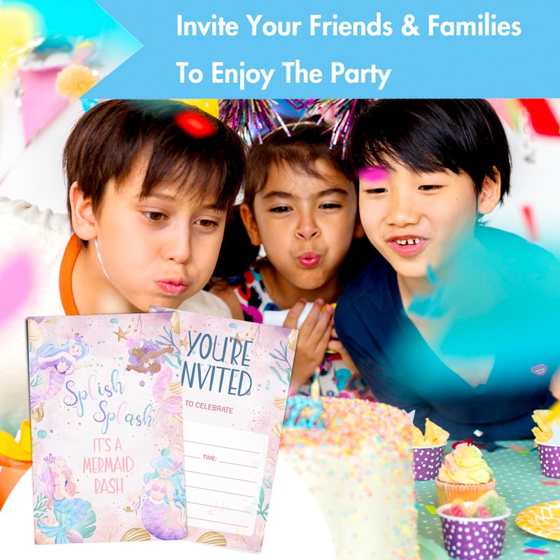 Mermaid Birthday Invitations, Mermaids Pool Party Invites with Envelopes (30PACK), Purple Pink Invites for Girls Teens, Ocean Theme Splish Splash Party Supplies